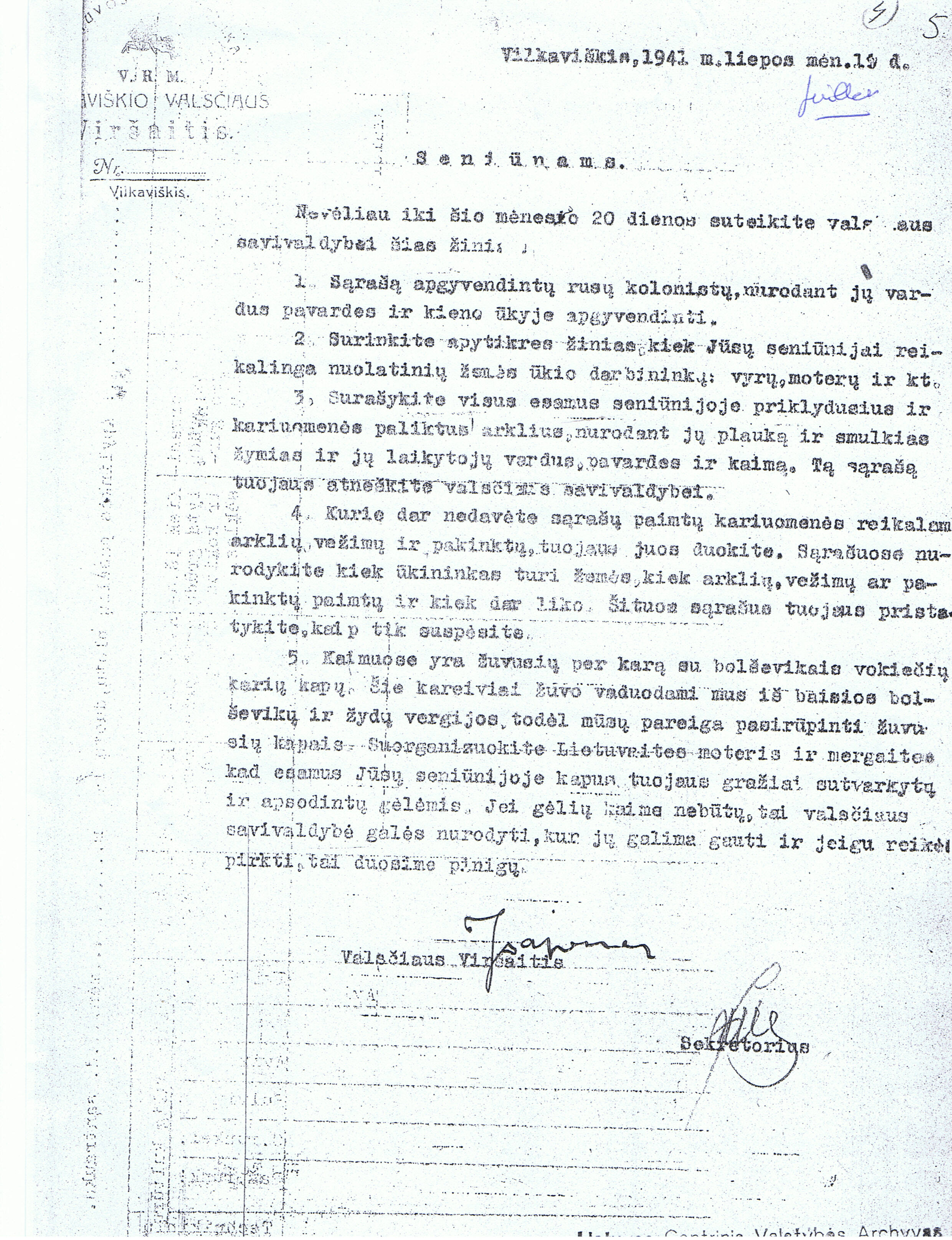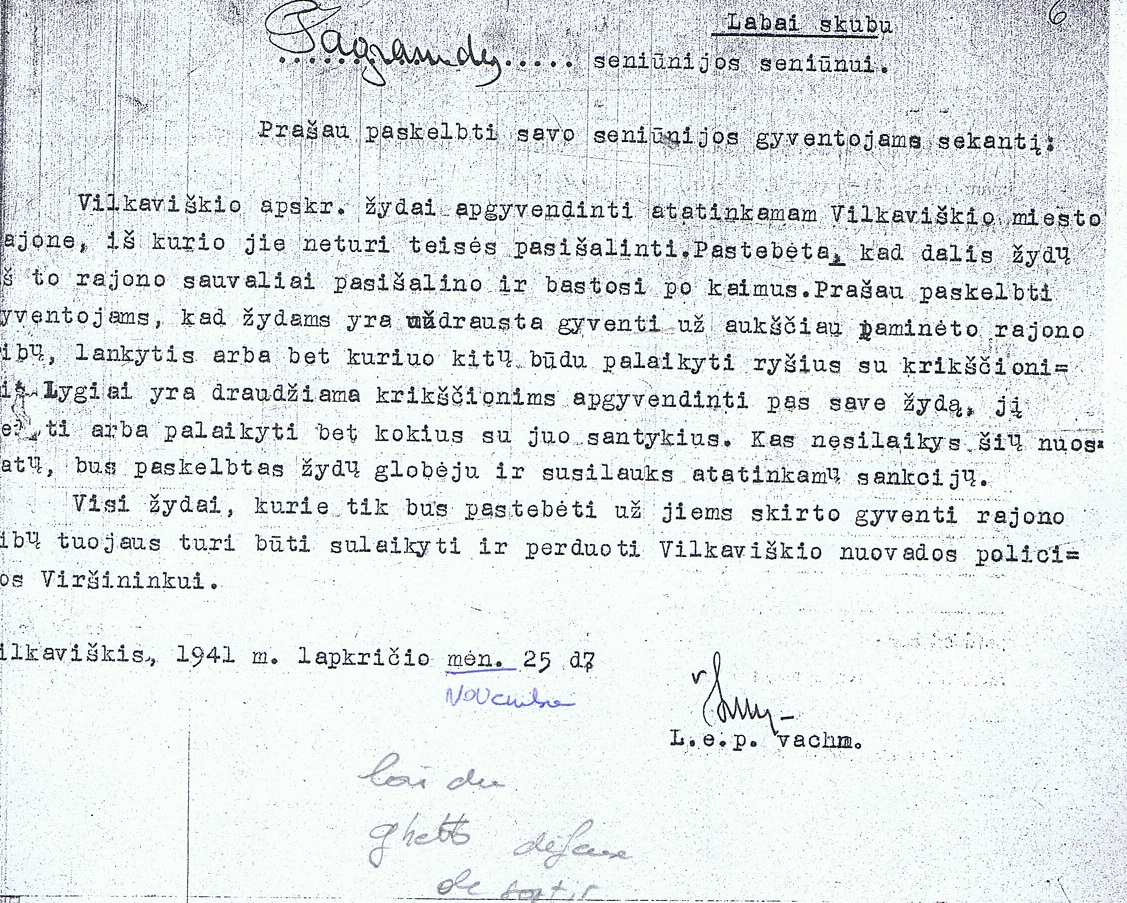 I also wanted to kill these Work Jews, including their families, which however brought upon me acrimonious challenges from the civil administration (the Reichskommisar) and the army and caused the prohibition: the Work Jews and their families are not to be shot! The goal of making Lithuania free of Jews could only be attained through the deployment of a raiding commando with selected men under the leadership of SS First Lieutenant Hamann, who completely and entirely adopted my goals and understood the importance of ensuring the co-operation of the Lithuanian partisans and the competent civilian positions. The implementation of such activities is primarily a question of organization. The decision to systematically make every district free of Jews necessitated an exhaustive preparation of each individual operation and reconnaissance of the prevailing circumstances in the applicable district. The Jews had to be assembled at one or several locations. Depending on the number, a place for the required pits had to be found and the pits dug. The marching route from the assembly place to the pits amounted on average to 4 to 5 kilometers. The Jews were transported to the place of execution in detachments of 500, at intervals of at least 2 kilometers. The attendant difficulties and nerve-wracking activity occasioned in doing this are shown in a randomly selected example: In Rokiskis, 3,208 people had to be transported 4.5 kilometers before they could be liquidated. To accomplish this task in 24 hours, more than 60 of the 80 available Lithuanian partisans had to be allocated for transportation and cordoning off duty.